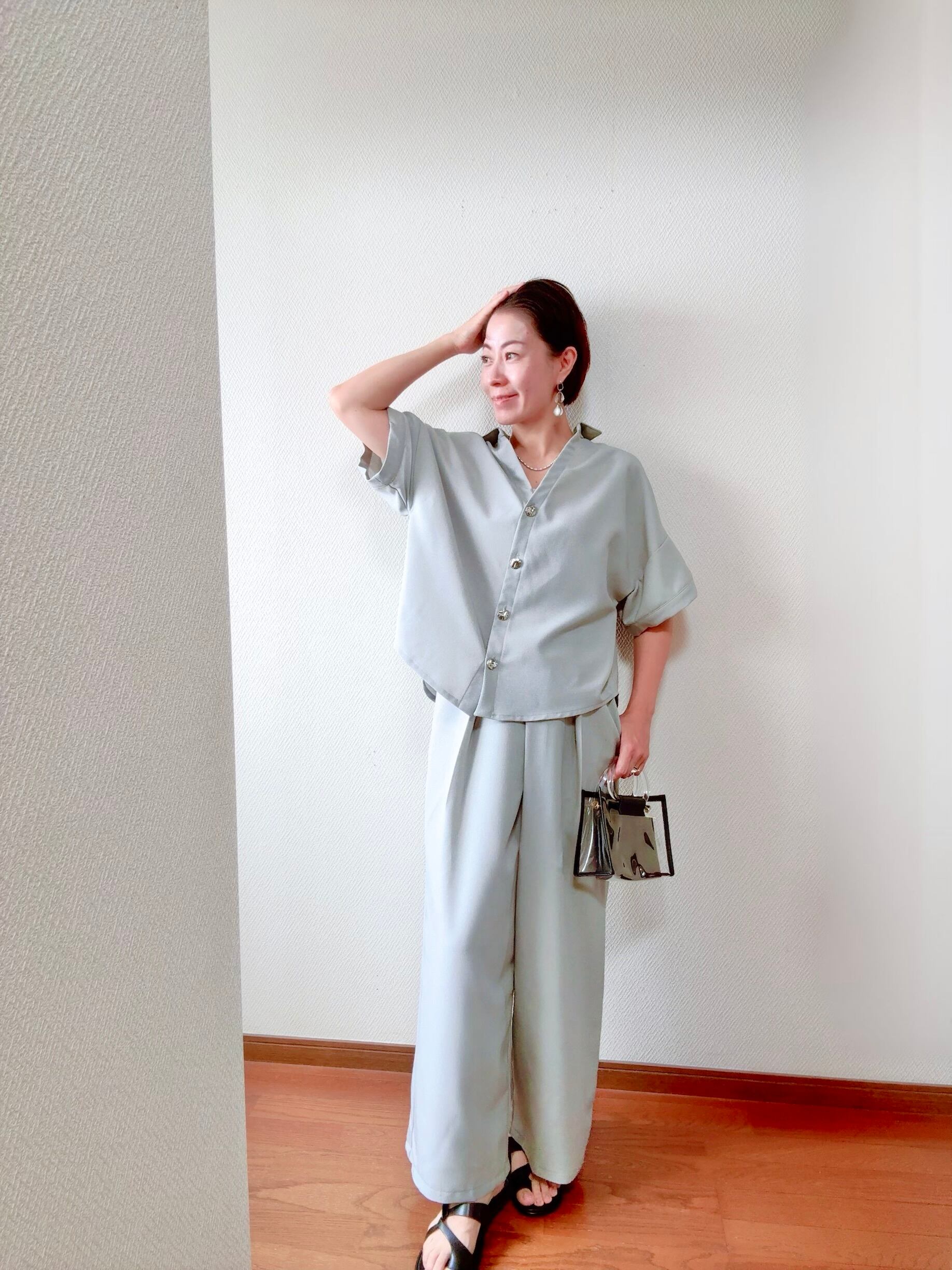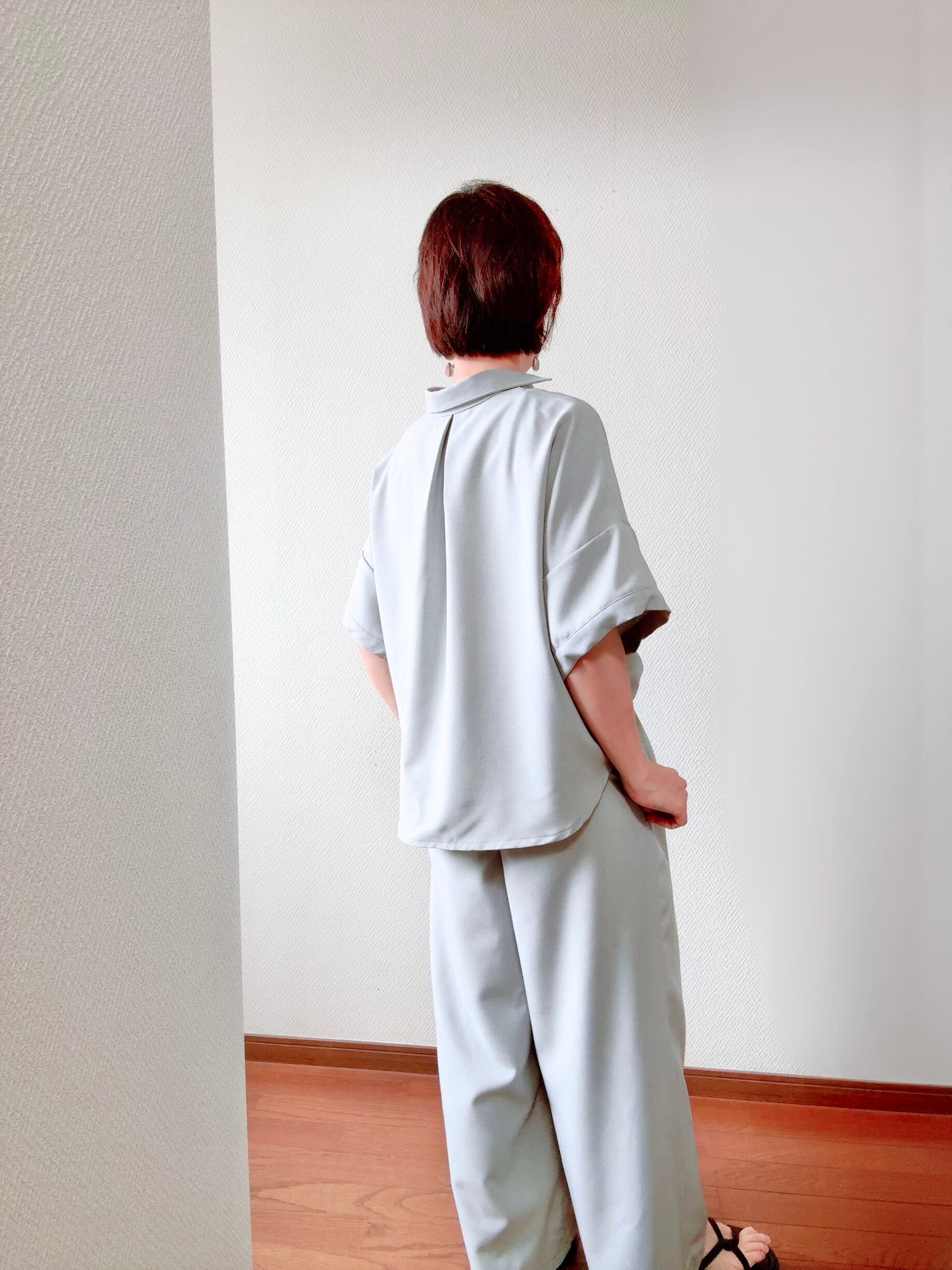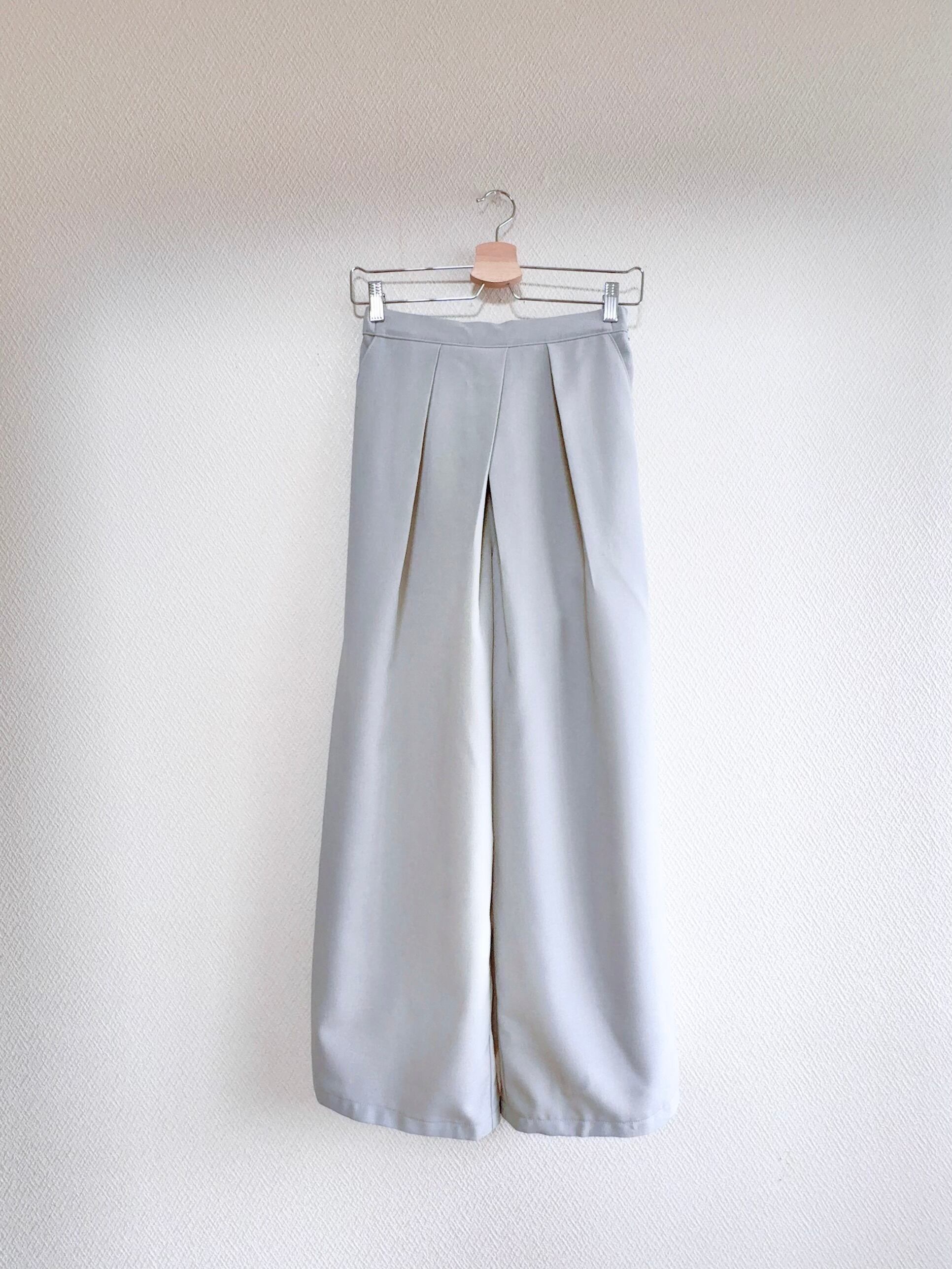 パンツは前にタックをたっぷりとり、後ろベルトのみに