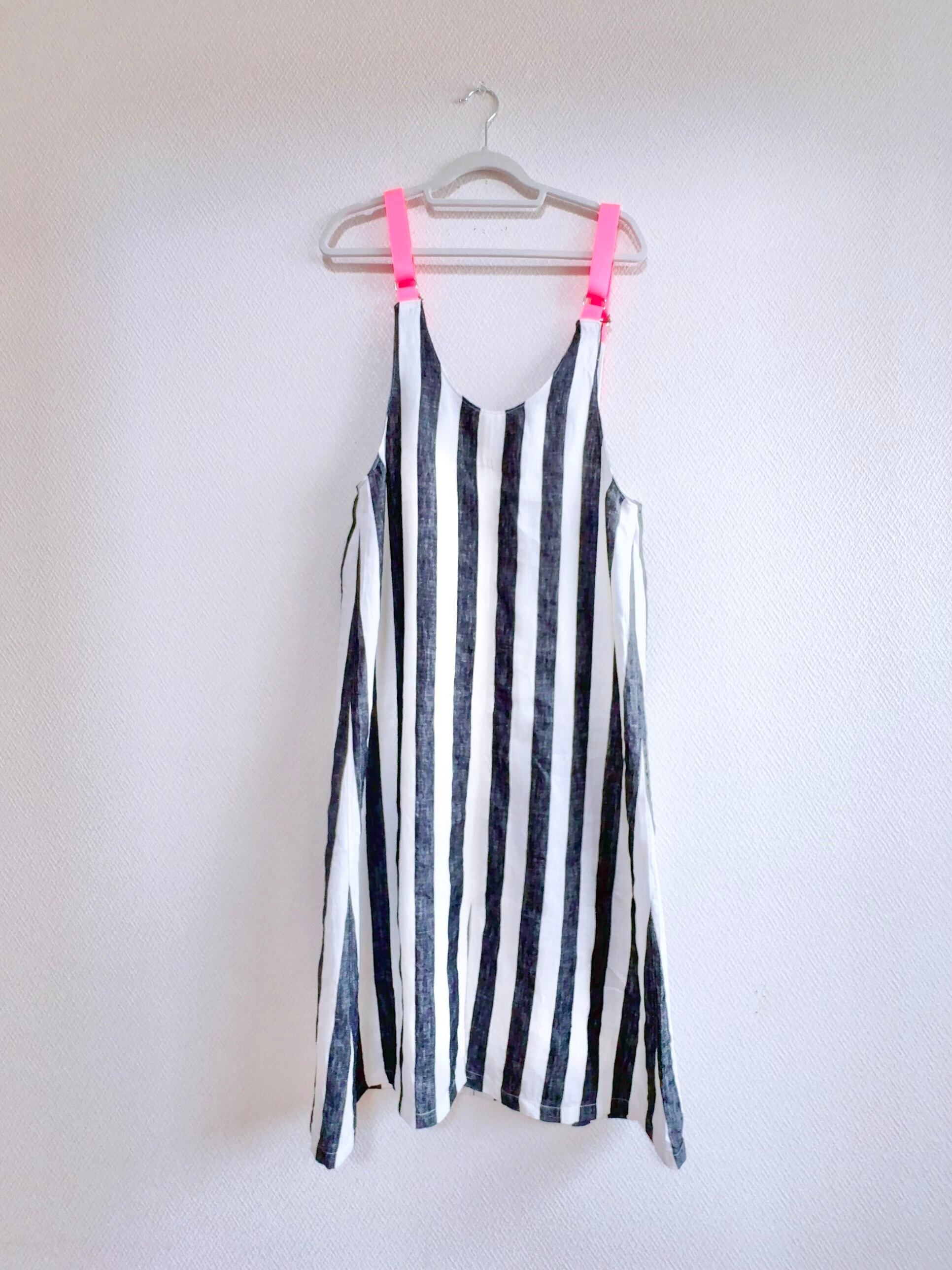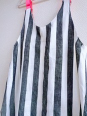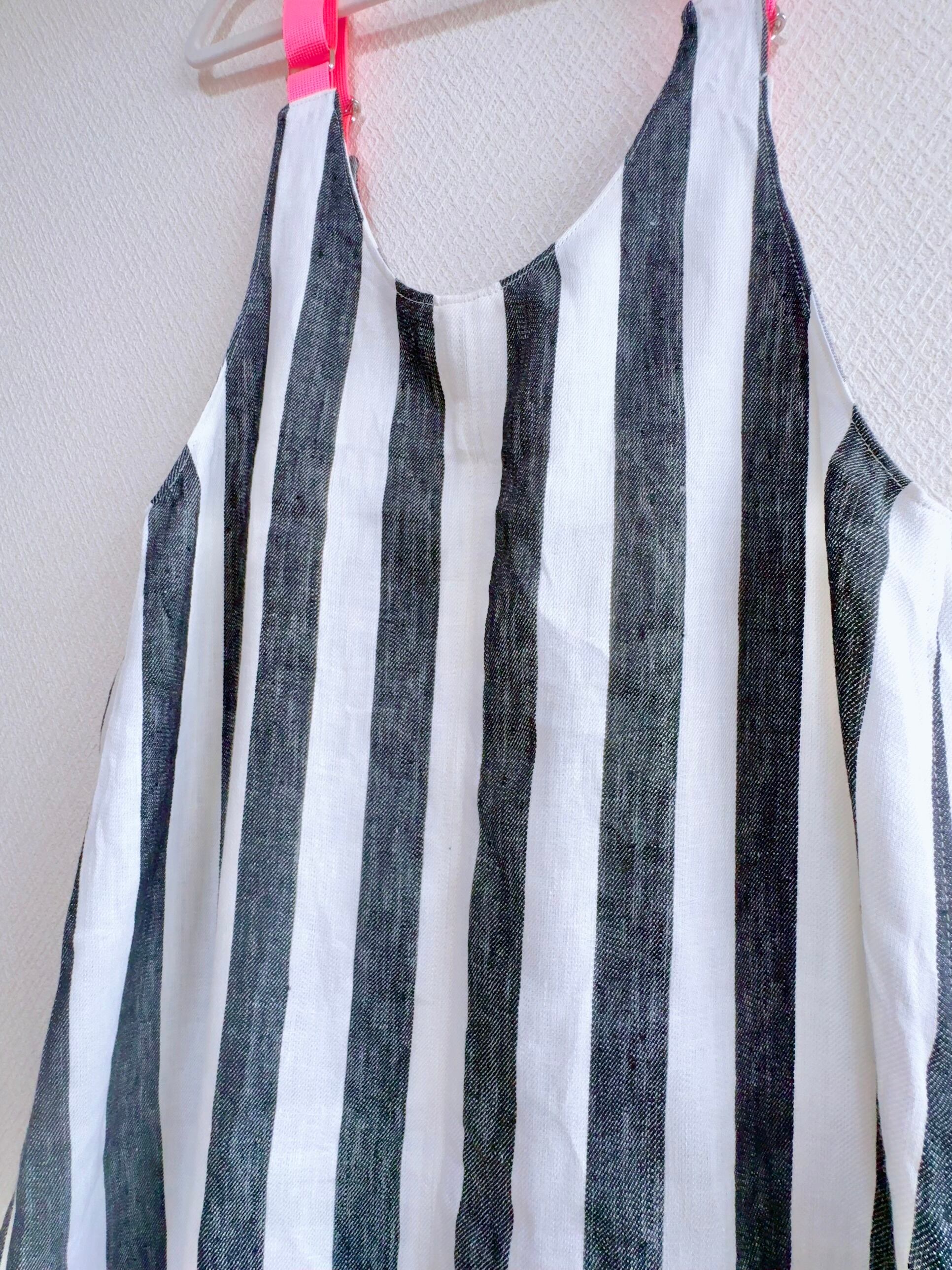 生地はグレーと白のストライプ柄のリネン生地を使用していますの、サラリと涼しく丈夫で、とっても気持ちいいです♡