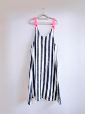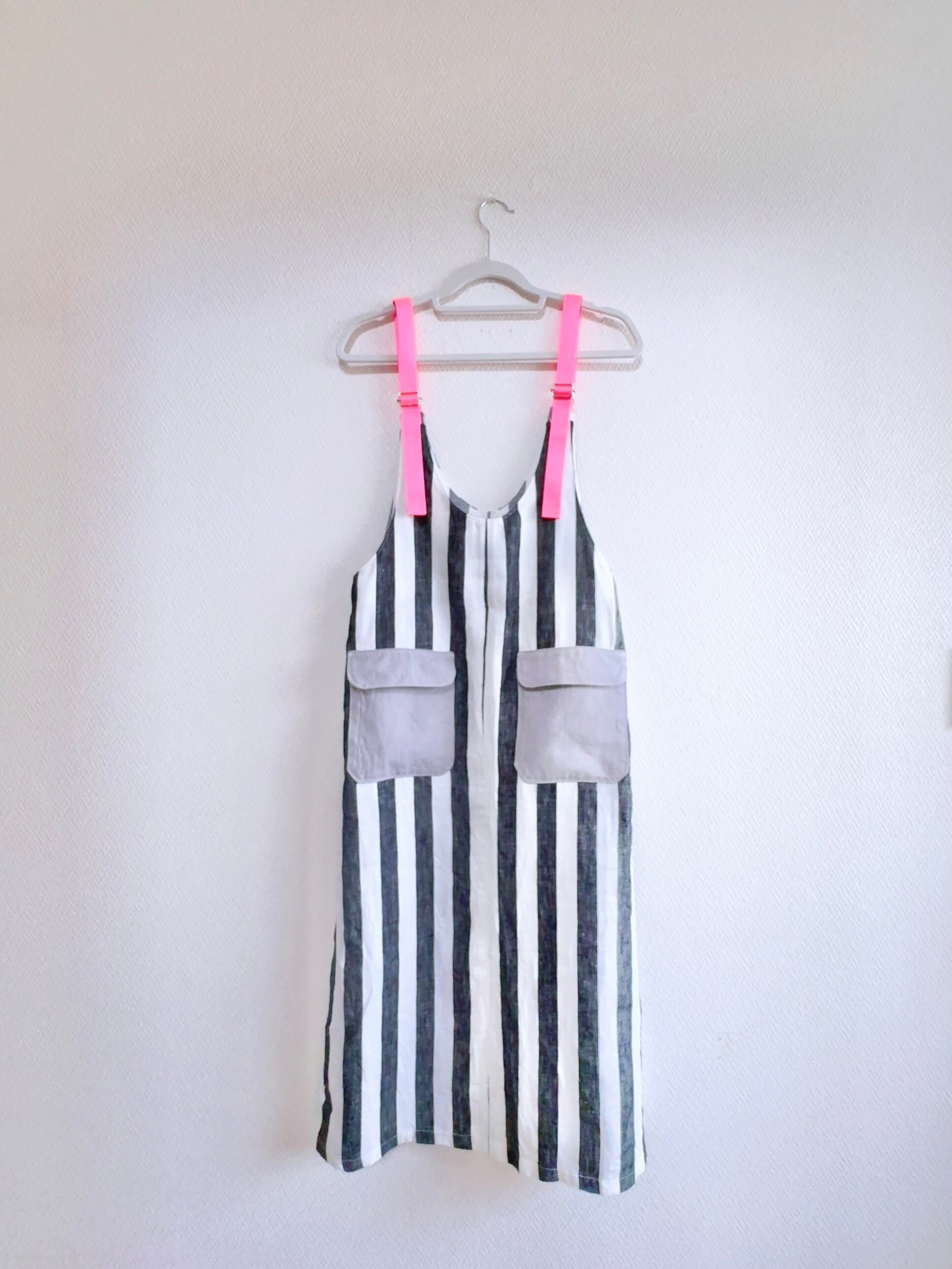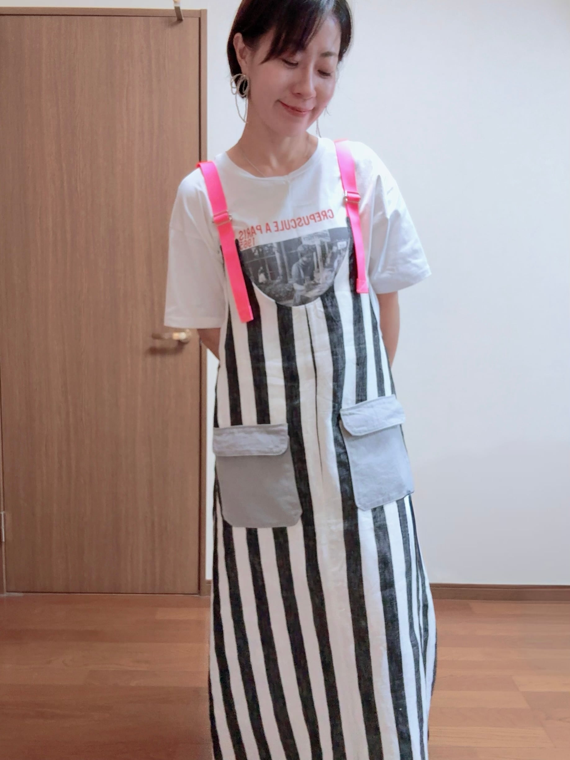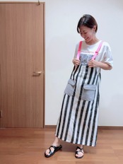 肩紐にビビッドな蛍光ピンクを使い、元気になるサロペットスカートです。